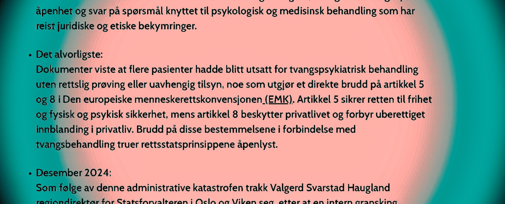 Denne helheten reiser grunnleggende spørsmål om prosedyrsikkerhet, rettssikkerhet og skillet mellom medisinsk myndighet og individets rettigheter, og understreker behovet for en uavhengig gjennomgang for å sikre at helseinstitusjoner ikke blir brukt i praksiser utenfor sitt profesjonelle og humanitære rammeverk i Oslo.