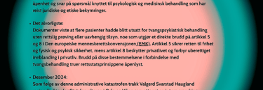 Disse overgrepene viser en tydelig kløft mellom de annonserte løftene og den faktiske praksisen, og demonstrerer hvordan en avdeling som skal gi omsorg, kan bli et verktøy for trusler og press, langt fra de medisinske og humane målene som er offentlig erklært, i strid med nasjonale og internasjonale standarder for pasientrettigheter og medisinsk etikk.